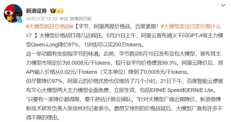 百度雖然強(qiáng)調(diào)“價(jià)格并不能決定大模型的好壞”,但也很誠(chéng)實(shí)地把文心的兩款主力大模型ERNIE Speed和ERNIE Lite直接免費(fèi)了;阿里旗下的通義也同時(shí)把商業(yè)化模型和開源模型大幅降價(jià)、限免。