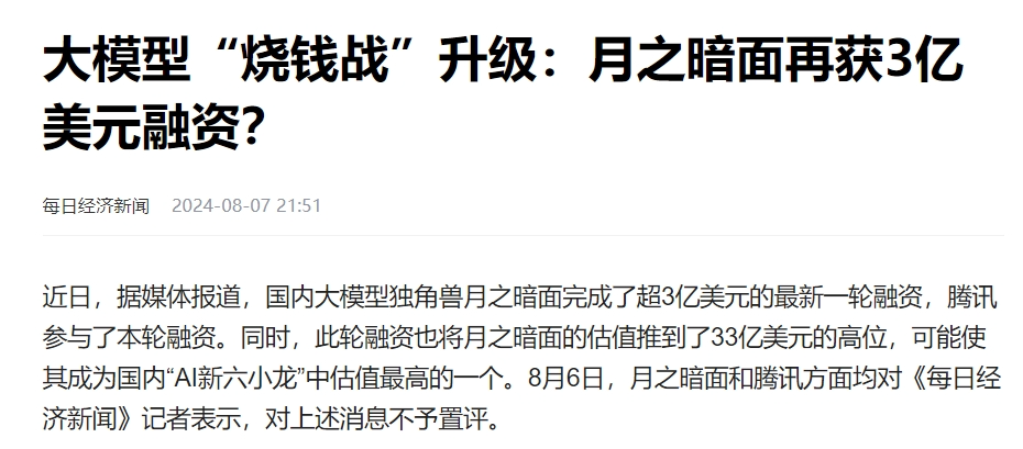 Kimi的商業(yè)化仍在初期,營(yíng)銷燒的只能是融資的錢。近日,有媒體報(bào)道稱月之暗面完成了超3億美元的最新融資,騰訊參與了本輪融資,月之暗面最新估值也隨之推高至33億美元。