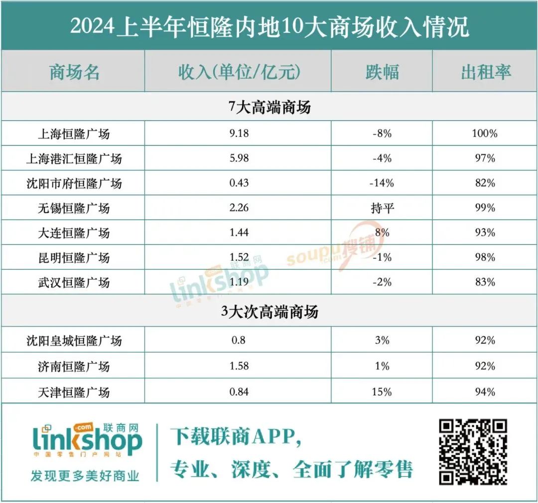 不過,值得關(guān)注的是,銷售額的下滑在高端購物中心較為明顯,而部分次高端或者走平民消費(fèi)路線的購物中心,反而有增長,比如沈陽皇城恒隆廣場、濟(jì)南恒隆廣場、天津恒隆廣場。
