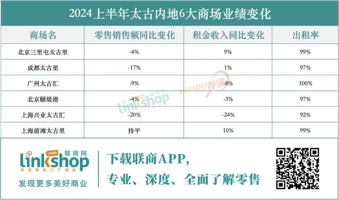 據(jù)太古地產(chǎn)2024上半年財(cái)報(bào)顯示,太古地產(chǎn)上半年總收入72.79億港元,與上年同期持平;零售物業(yè)租金收入36.82億港元,較去年同期增長4.9%。內(nèi)地零售物業(yè)上,太古上半年內(nèi)地商場整體零售銷售額同比上升了4%,但具體到項(xiàng)目上看,依然呈現(xiàn)了高端商場主跌,綜合類商場相對穩(wěn)定的格局。