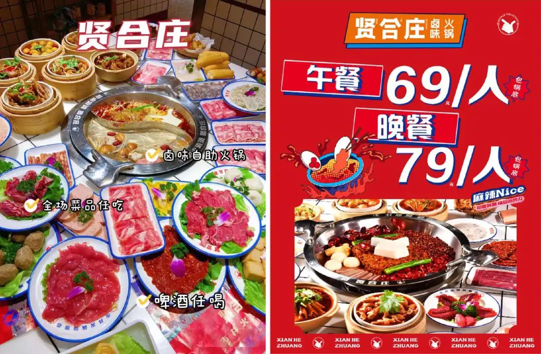大約在2022年,全國多家賢合莊升級為“自助火鍋”,涮菜、海鮮、甜品、鹵味......無限暢吃,一些曾經(jīng)光顧過賢合莊的顧客接受相關(guān)媒體采訪表示,“之前一直點單模式感覺味道還可以,改自助之后鹵菜寡淡無味,自助的和點單的盤子都不一樣!