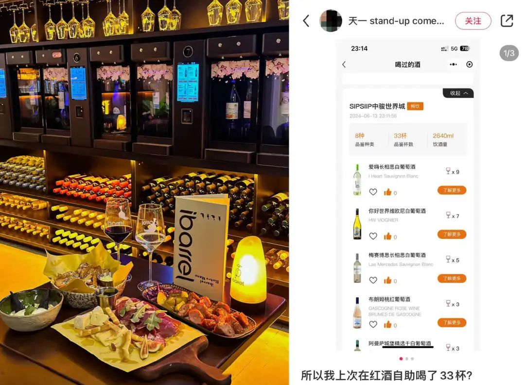 今年6月,某脫口秀演員在北京的葡萄酒暢飲酒館Sip Siip團購了一張99元/3小時的暢飲券,并在小紅書上曬出了自己當晚的飲酒記錄,引發(fā)網(wǎng)友討論。