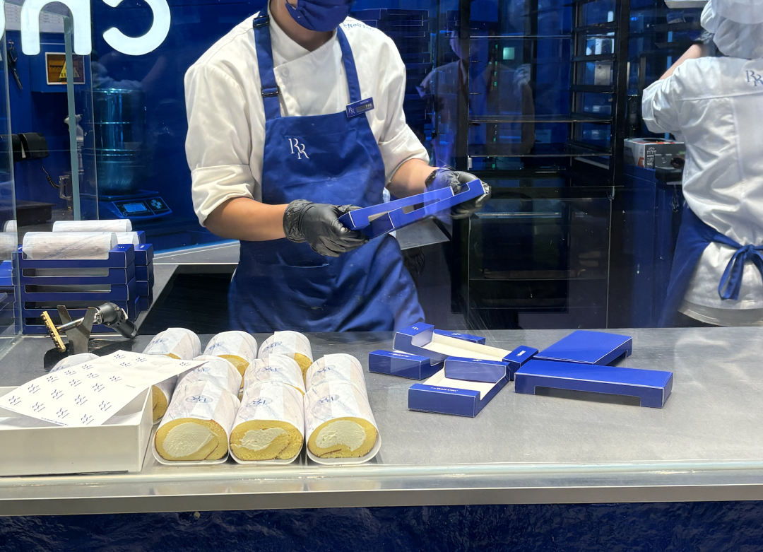 像芝士蛋糕品牌KUMO KUMO,不同口味的芝士蛋糕按點出爐,出爐時還會搖鈴,再給蛋糕打上logo,儀式感拉滿。它的兄弟品牌Roll'ING瑞士卷把這種一絲不茍的精神發(fā)揮到了極致。