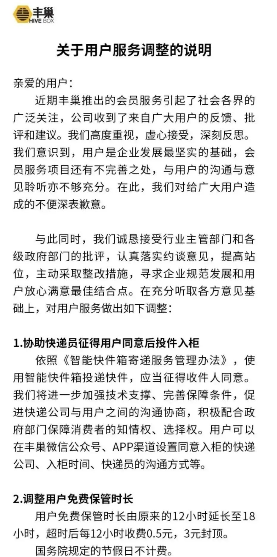 面對(duì)如此強(qiáng)烈的社會(huì)質(zhì)疑,豐巢最終選擇了讓步,將快遞的免費(fèi)寄存時(shí)間延長(zhǎng)至18小時(shí),并同時(shí)向已購(gòu)買會(huì)員服務(wù)的用戶贈(zèng)送一個(gè)月的會(huì)員期限。