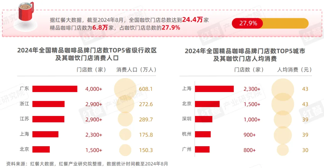 從門店數(shù)的維度看,精品咖啡門店數(shù)占咖飲門店數(shù)近三成,其中,上海與北京的“咖啡血液”濃。據(jù)紅餐大數(shù)據(jù),截至2024年8月我國精品咖啡的門店數(shù)為6.8萬家,占全國咖飲門店總數(shù)的27.9%。