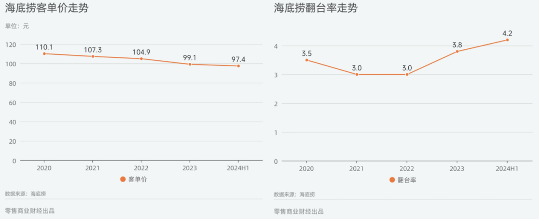 拋開客觀因素,這份營(yíng)收增長(zhǎng)的財(cái)報(bào)“暗處”還透露出另一條可能影響利潤(rùn)的主線,即客單價(jià)下滑的同時(shí),翻臺(tái)率和客流量上漲。這表明,“低價(jià)”或?yàn)楹5讚婆まD(zhuǎn)局面的最優(yōu)解。