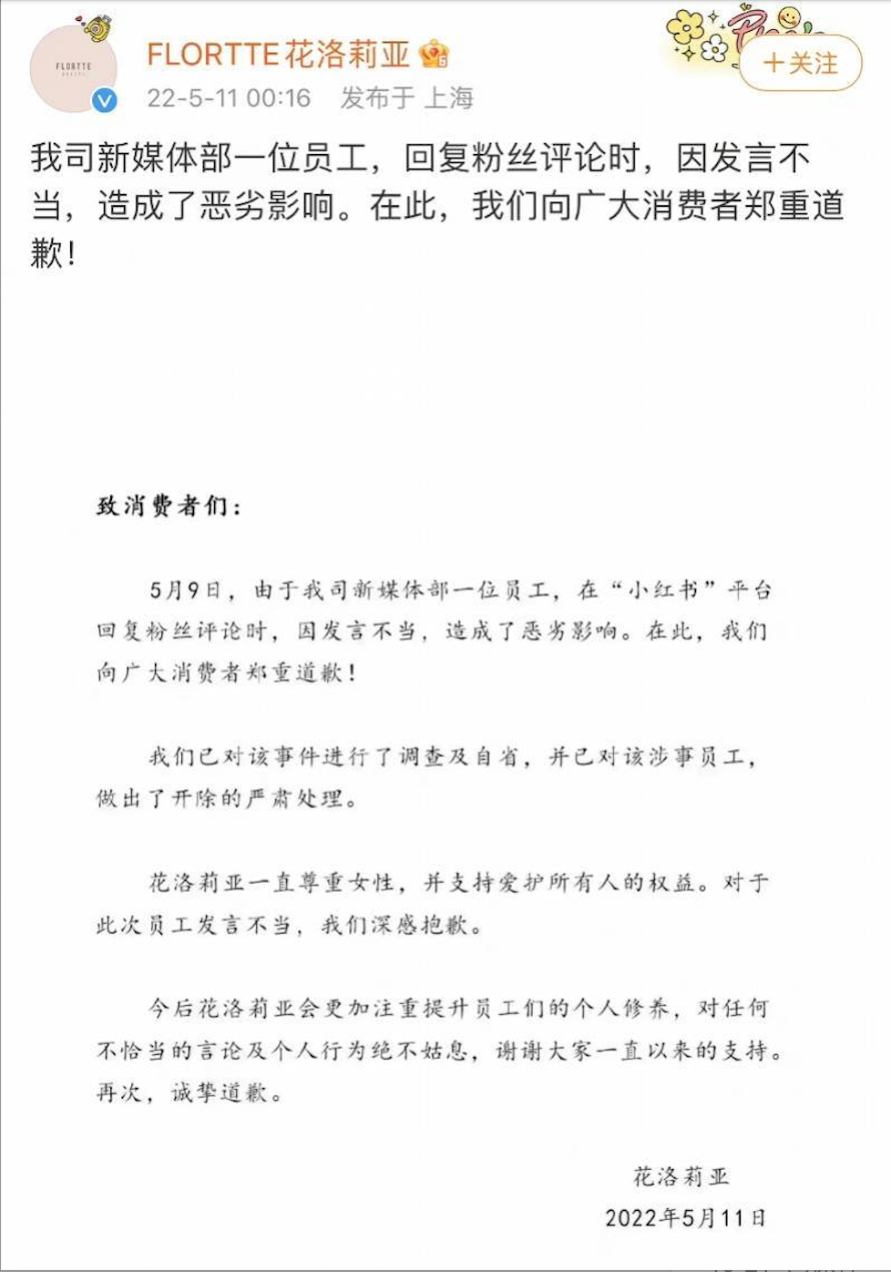 目前,在上述兩個品牌各大官方賬號下已有不少消費者表示憤怒,聲稱不會再購買該品牌產(chǎn)品。截至發(fā)稿,花洛莉亞暫未對此事做出正面回應(yīng)。