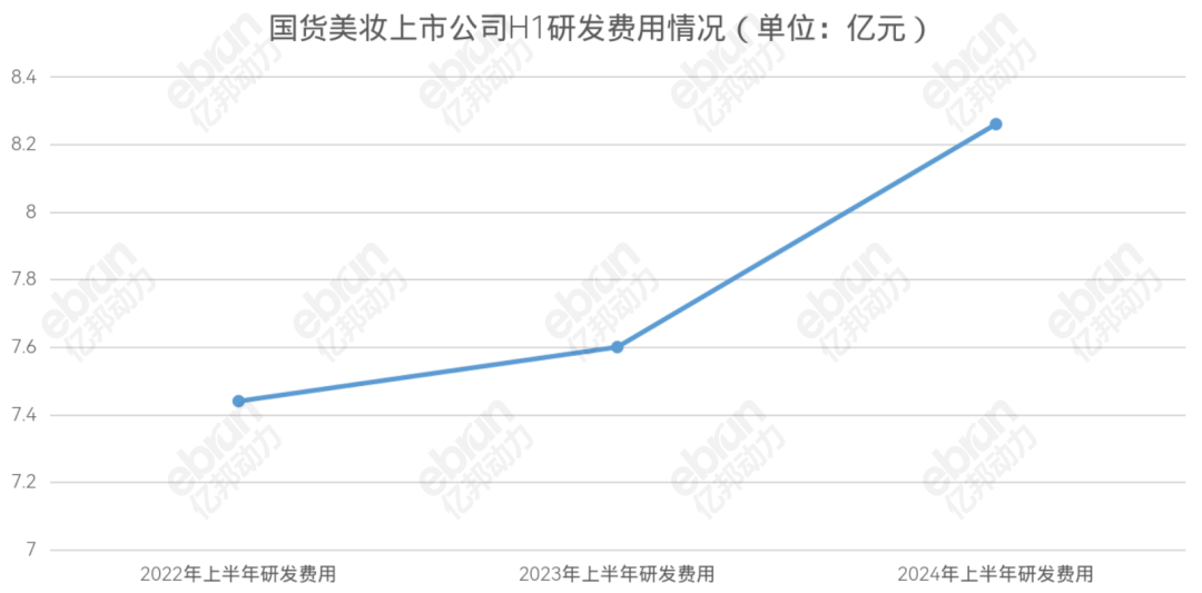 與營(yíng)銷相對(duì)應(yīng)的,是各家研發(fā)費(fèi)用的顯著增長(zhǎng)。12家公司中,除上海家化和水羊股份的研發(fā)費(fèi)用同比下降,其余10家的研發(fā)費(fèi)用均同比增加。在研發(fā)費(fèi)用總額上,2024年上半年達(dá)8.26億元,同比增長(zhǎng)8.68%,同比增長(zhǎng)率遠(yuǎn)高于2023年同期。