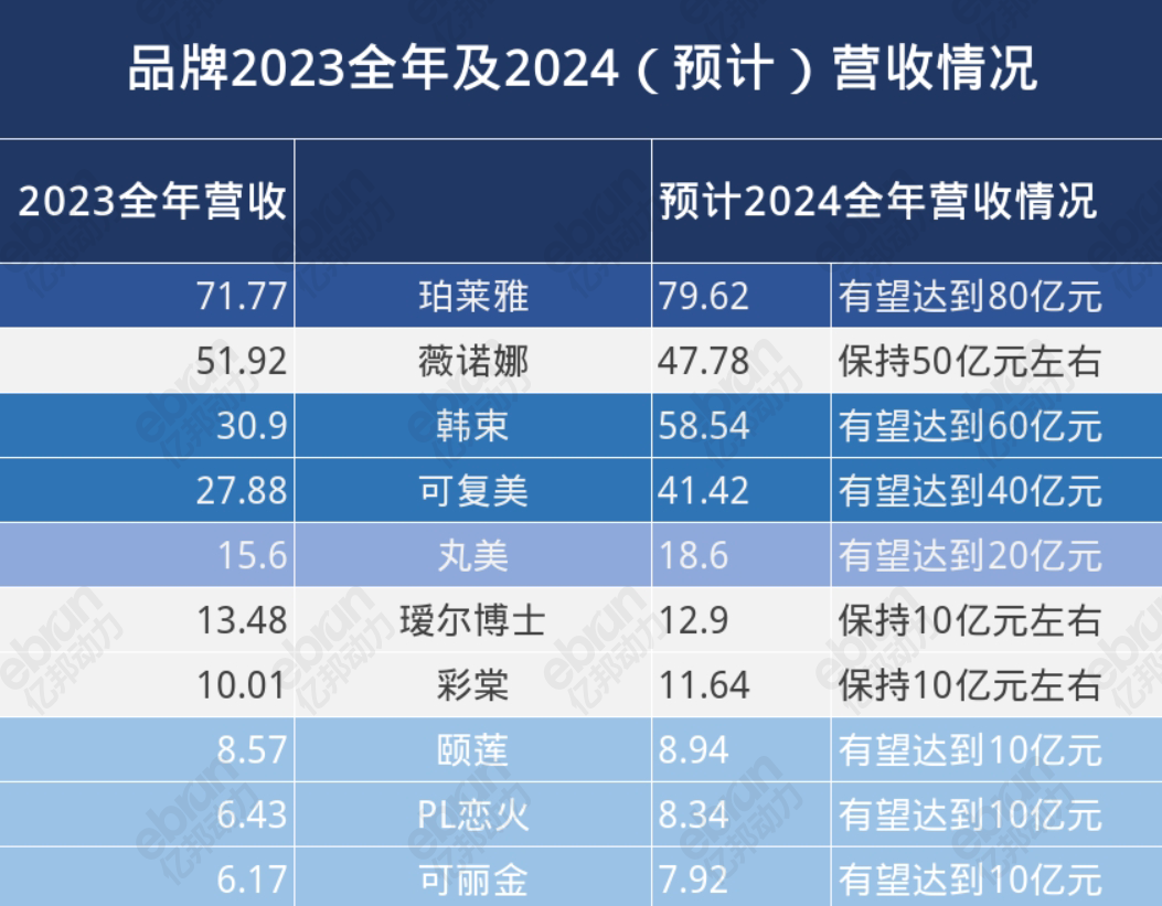 備受矚目的珀萊雅品牌,在2023全年?duì)I收達(dá)71.77億元、領(lǐng)先第二名近20億元后,今年的營(yíng)收有望達(dá)到80億元,且持續(xù)保持超前領(lǐng)先的地位,或?qū)⒊掷m(xù)領(lǐng)先第二名近20億元。有媒體預(yù)測(cè),其背后的珀萊雅公司,在今年有望成為國(guó)內(nèi)首個(gè)營(yíng)收達(dá)百億的中國(guó)美妝上市公司。