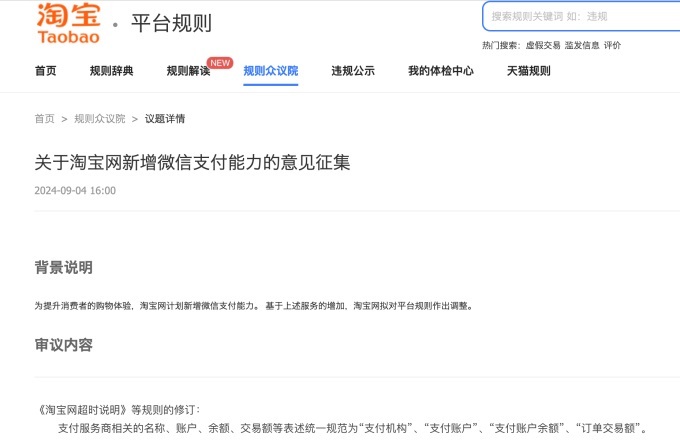 據(jù)了解,9月4日下午,淘寶平臺(tái)規(guī)則大廳發(fā)布了《關(guān)于淘寶網(wǎng)新增微信支付能力的意見(jiàn)征集》。淘寶方面表示,為提升消費(fèi)者的購(gòu)物體驗(yàn),淘寶網(wǎng)計(jì)劃新增微信支付能力;谏鲜龇⻊(wù)的增加,淘寶網(wǎng)擬對(duì)平臺(tái)規(guī)則作出調(diào)整。