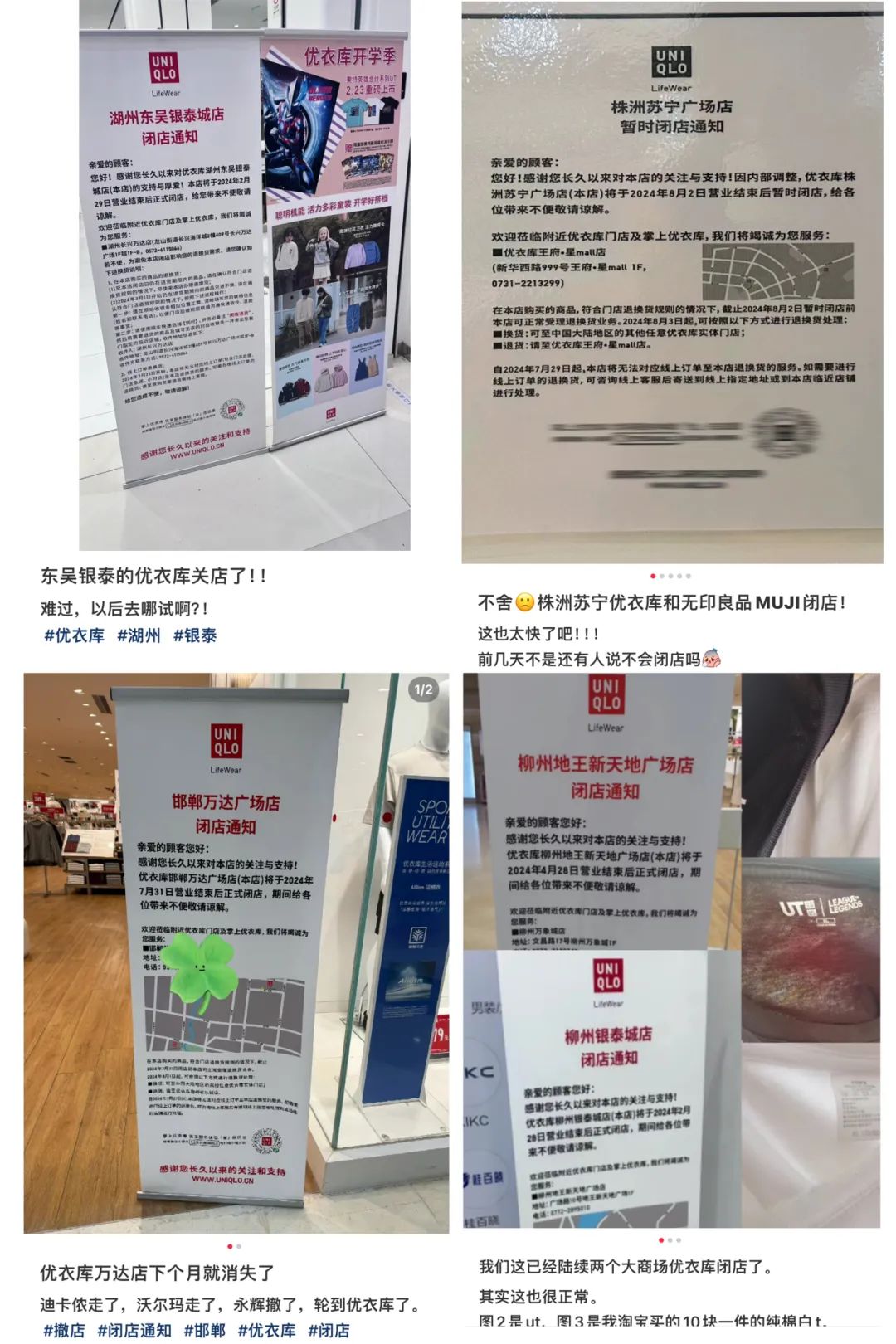 在社交平臺上,可以看到眾多網(wǎng)友分享自己所在城市優(yōu)衣庫關(guān)店的信息,今年優(yōu)衣庫先后關(guān)閉臨沂、濟(jì)寧、柳州、湖州、泉州、株洲、紹興、福州、濟(jì)南等多地個別門店,其中大部分門店位于下沉市場。