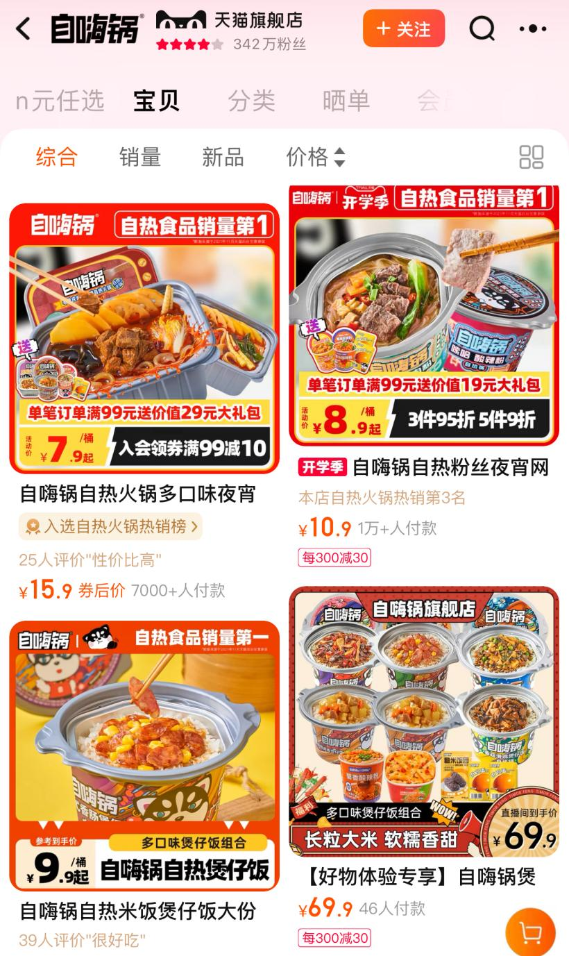 客觀來說,自嗨鍋并非沒有主動尋求“自救”方案。事實上,過去一兩年自嗨鍋的官方微信公眾號上經(jīng)常發(fā)布一些促銷信息,官方旗艦店很多規(guī)格在200克左右的產(chǎn)品價格已經(jīng)低至9.9元。關(guān)鍵在于低價早已充斥整個門檻較低的自熱火鍋賽道,本身產(chǎn)品就有很多“硬傷”,只靠降價難以挽回消費者的口碑。