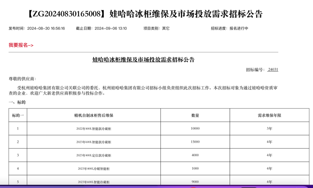 8月30日,娃哈哈官網(wǎng)發(fā)布了“冰柜維保及市場投放需求招標公告”,涉及617735個冰柜不同年限的維保和10萬個智能冰柜的招標。