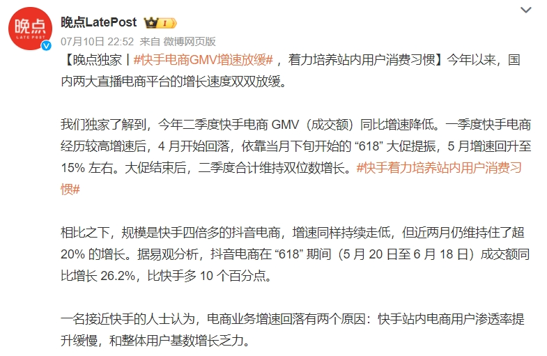 8月20日,快手在披露二季度業(yè)績(jī)后,股價(jià)異動(dòng)大跌,跌幅超過(guò)10%。市場(chǎng)將原因歸咎于其電商商品交易總額增長(zhǎng)放緩,數(shù)據(jù)顯示,二季度電商GMV同比增長(zhǎng)15%至3053億元,較此前有所下滑。