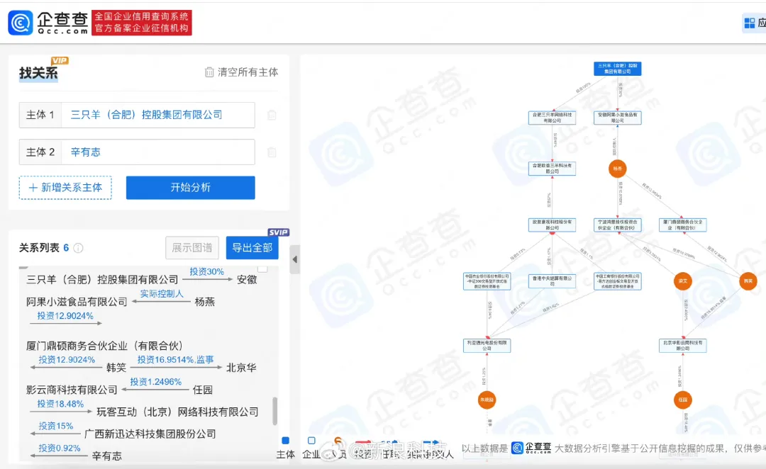 值得一提的是,通過(guò)“企查查”進(jìn)行股權(quán)穿透發(fā)現(xiàn),三只羊(合肥)控股集團(tuán)有限公司與辛巴(辛有志)存在部分商業(yè)聯(lián)系。