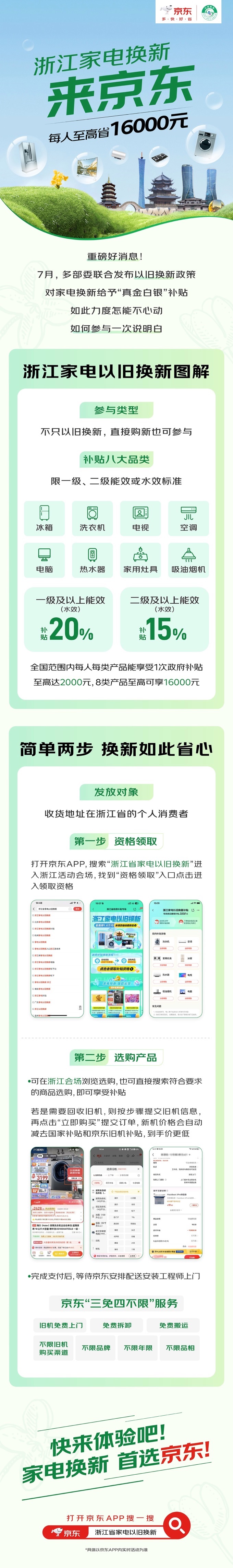 浙江以舊換新落地方案發(fā)布,對8類家電產(chǎn)品給予“真金白銀”補(bǔ)貼。京東承接了浙江家電以舊換新補(bǔ)貼的線上發(fā)放工作,9月5日上線浙江活動會場,收貨地址在浙江省的消費者來京東買家電,以舊換新或是直接購新均可領(lǐng)用補(bǔ)貼。全國范圍內(nèi)每人每類產(chǎn)品可領(lǐng)用1次,每人每類產(chǎn)品至高補(bǔ)貼2000元,8類產(chǎn)品至高達(dá)16000元。