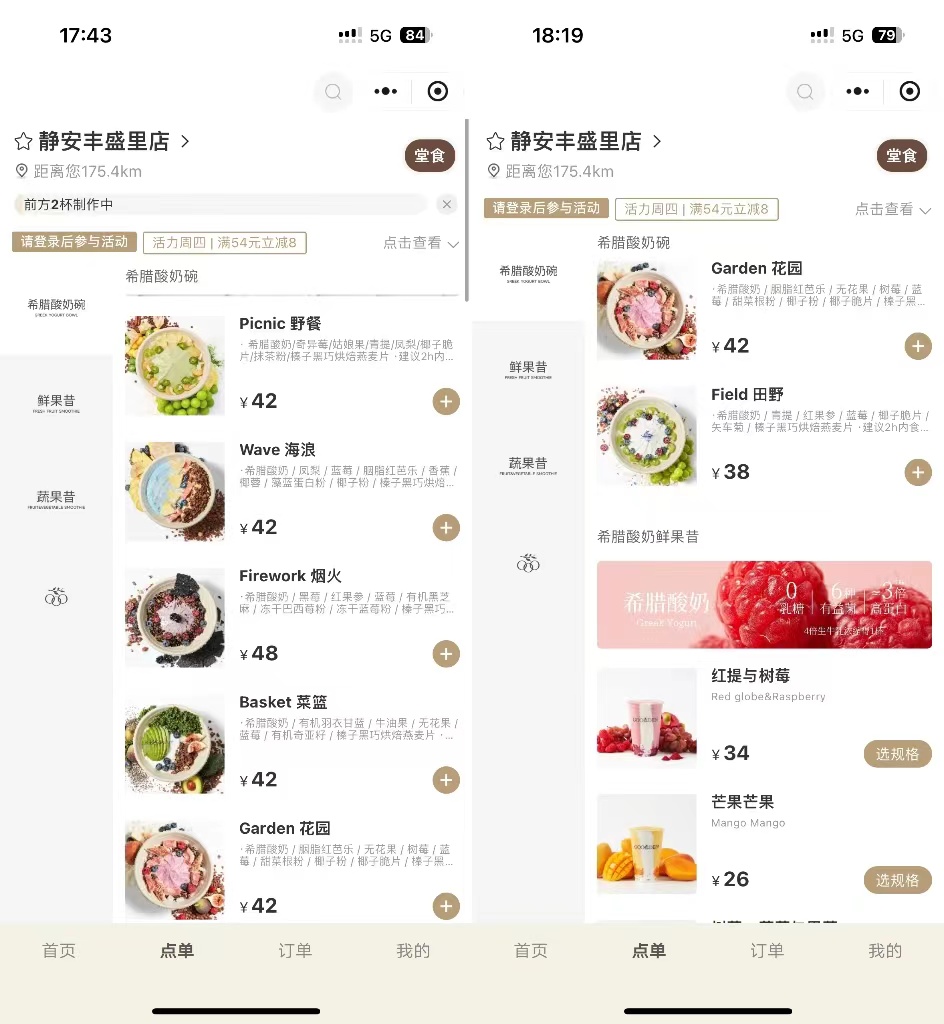 GOOOLDEN主要售賣的產(chǎn)品為希臘酸奶碗、鮮果昔、蔬果昔,其中,希臘酸奶碗的產(chǎn)品售價從38—42元不等,略高于茉酸奶。