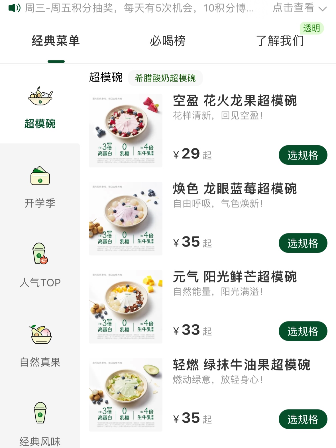 茶咖觀察在小程序中看到,茉酸奶共上線了4款超模碗,分別是:空盈 花火龍果超模碗、煥色 龍眼藍莓超模碗、元氣 陽光鮮芒超模碗、輕燃 綠抹牛油果超模碗,售價從29-35元不等。