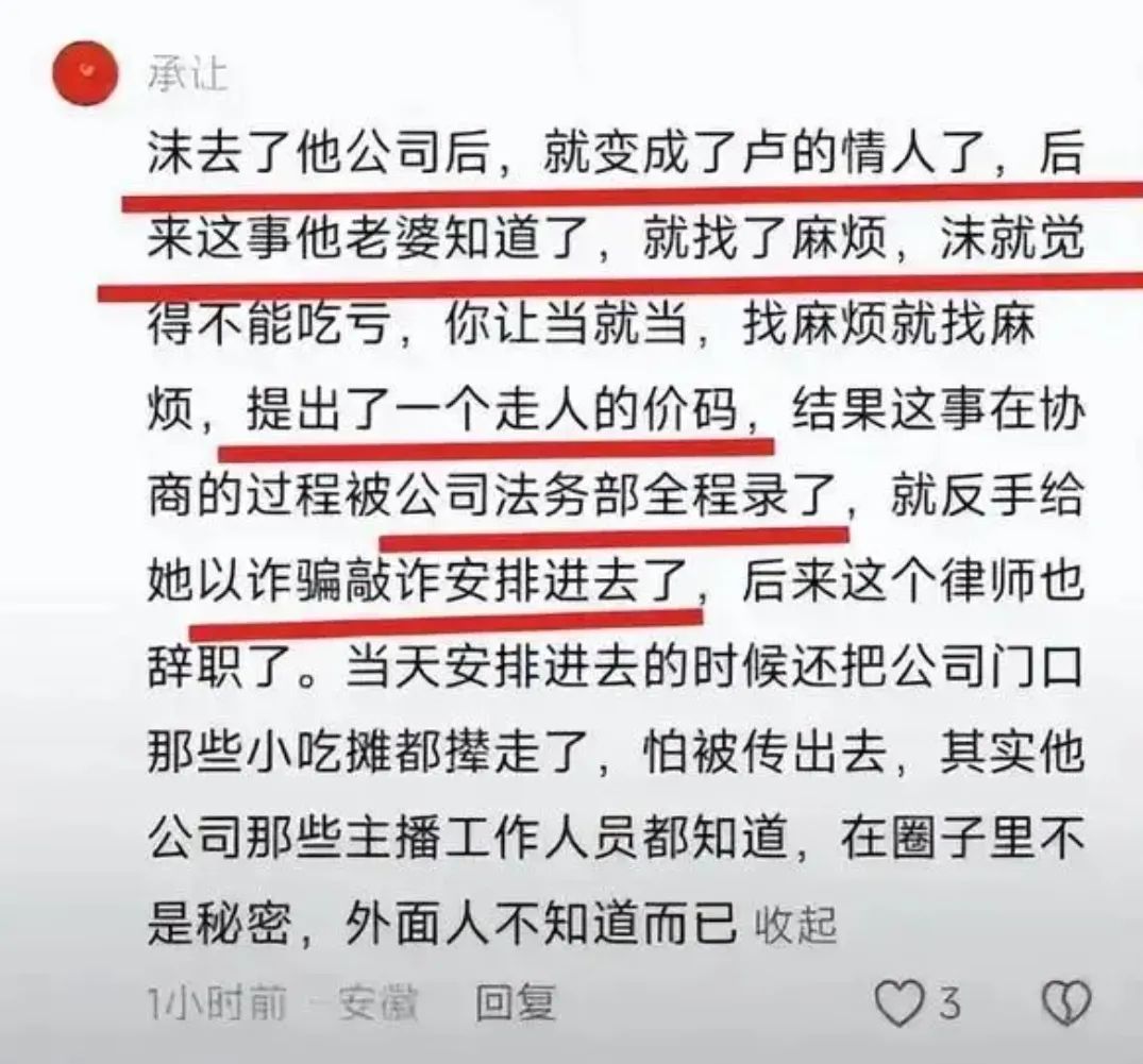 甚至有網(wǎng)友在抖音評論區(qū)曝光更多猛料,表示盧文慶和三只羊的法務(wù)部同時參與了這次事件。