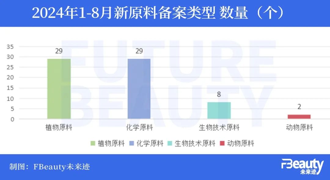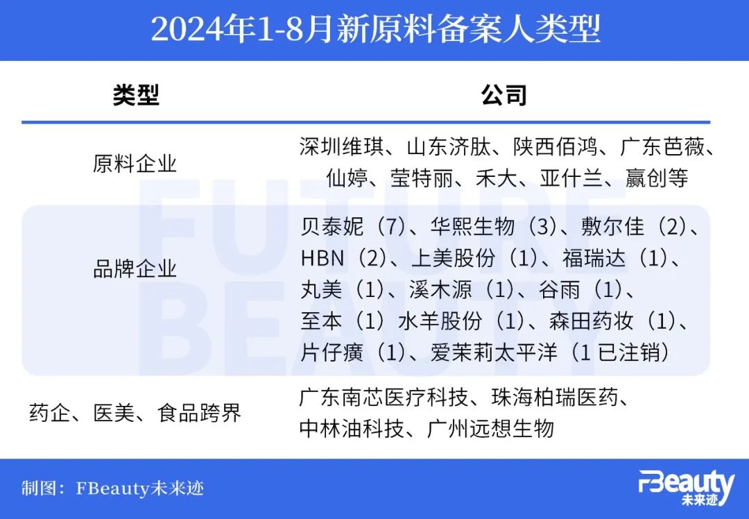 因此自2021年以來,新原料備案數(shù)量連年增加,呈現(xiàn)出“競賽升級”的大趨勢。在2024年,這種趨勢進一步升級,其中中國本土美妝品牌企業(yè)的動作尤其值得關注。