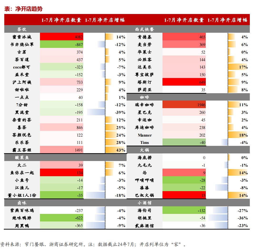 西式快餐/茶飲咖啡賽道仍在快速拓店。根據(jù)浙商證券報(bào)告,1-7月各大品牌的凈開(kāi)店數(shù)如下:蜜雪冰城開(kāi)店4082家、瑞幸咖啡開(kāi)店1946家、霸王茶姬開(kāi)店1491家、喜茶開(kāi)店846家、塔斯汀開(kāi)店649家、肯德基開(kāi)店465家、麥當(dāng)勞開(kāi)店369家。
