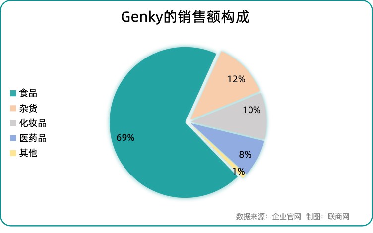 GENKY最新財(cái)年數(shù)據(jù)顯示,在整體銷(xiāo)售構(gòu)成中,食品占據(jù)了約70%的份額,日用品緊隨其后,占比僅為12%。相比之下,藥妝店的傳統(tǒng)核心品類(lèi)——化妝品和醫(yī)藥品分別僅占10%和8%。這一數(shù)據(jù)表明,該品牌的業(yè)務(wù)重心已大幅偏向食品領(lǐng)域,幾乎顛覆了人們對(duì)典型藥妝店的認(rèn)知。