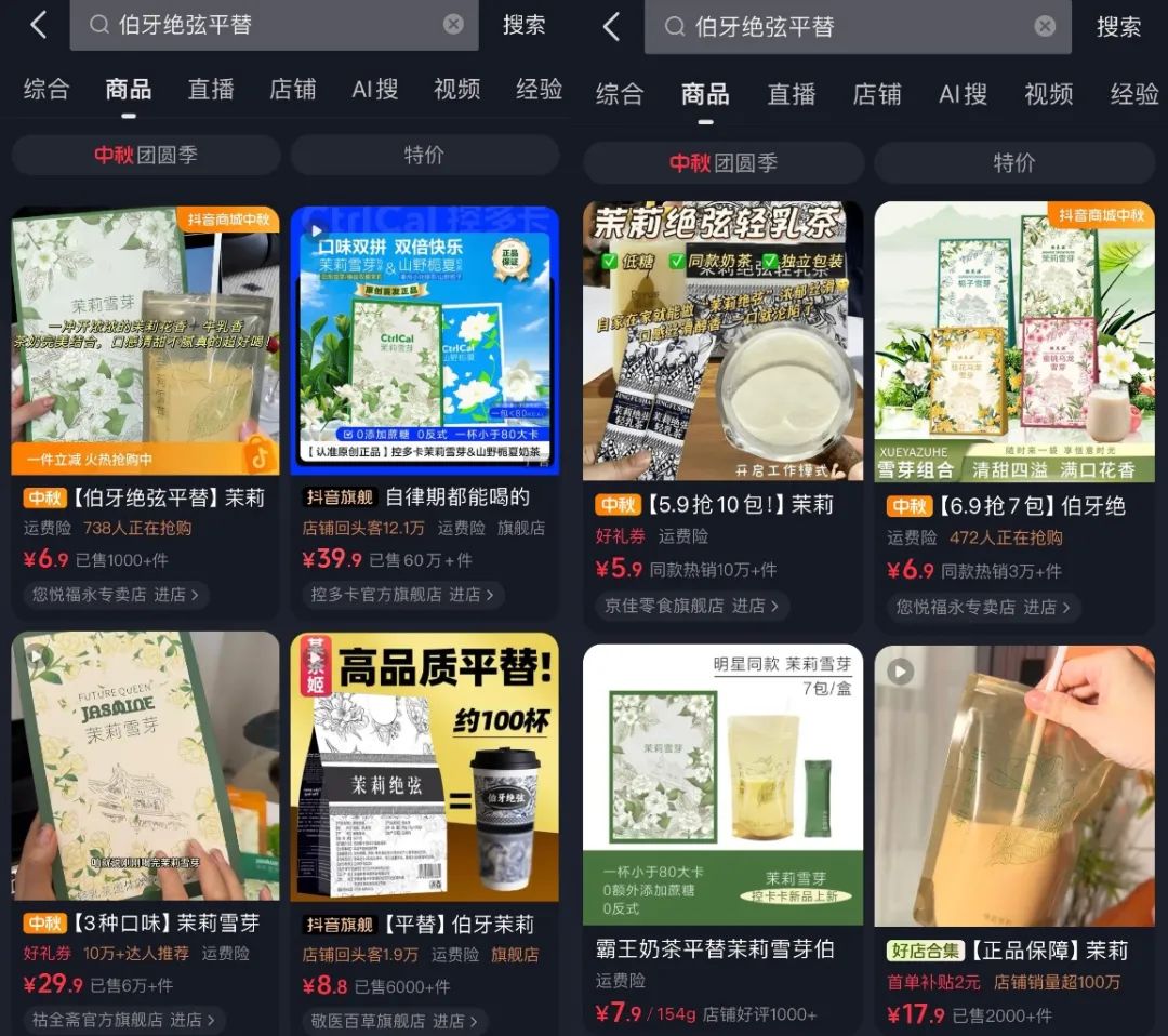 而伴隨著伯牙絕弦“平替”輕輕茉莉的爆火,也讓不少敏銳的商家看到機(jī)會(huì)。品飲匯發(fā)現(xiàn),在抖音平臺(tái)不少打著奶茶店同款的奶茶產(chǎn)品開始涌現(xiàn),其中銷量最高的控多卡已經(jīng)在全網(wǎng)賣出了1300萬袋。