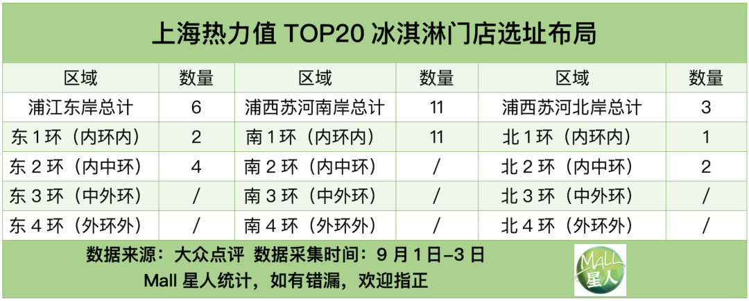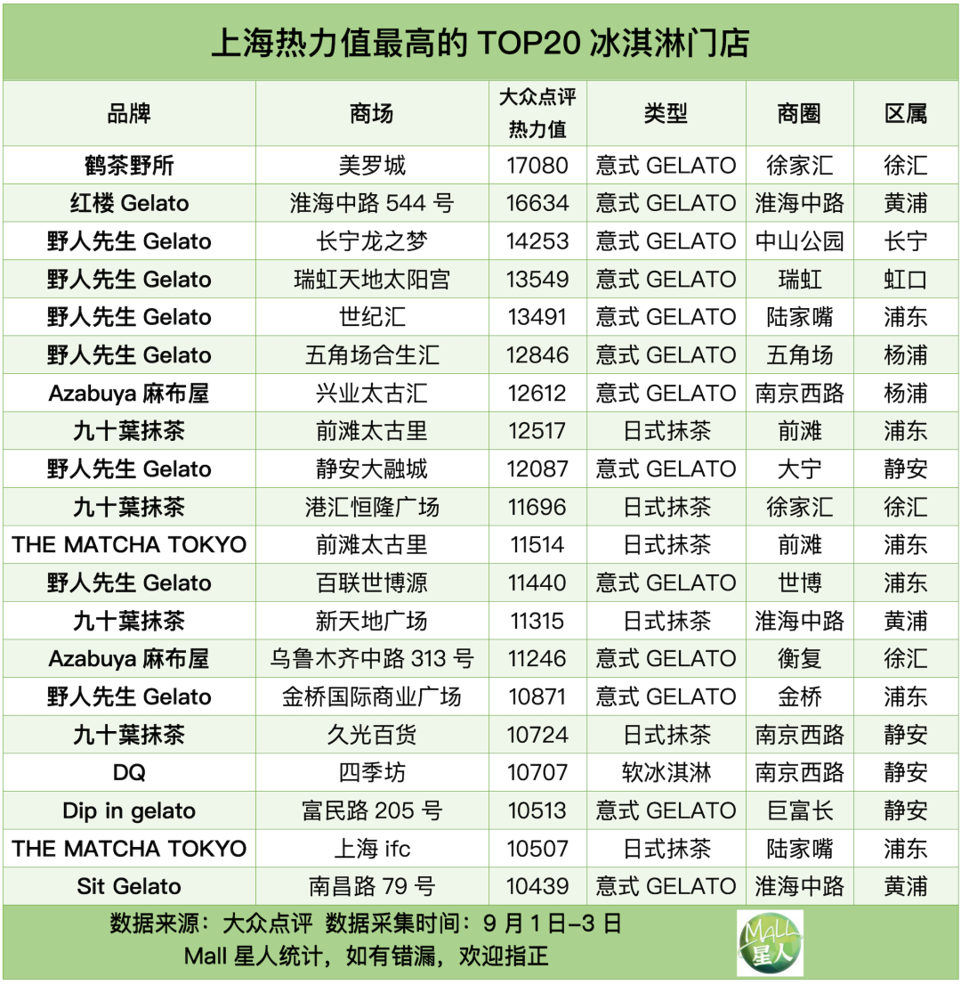 根據(jù)大眾點(diǎn)評的冰淇淋門店熱力值,Mall星人統(tǒng)計(jì)出上海目前最受歡迎的前10%冰淇淋門店,總計(jì)100家(由于篇幅限制,上海冰淇淋熱力值TOP100門店全名單請查看今日推文的次條內(nèi)容)。