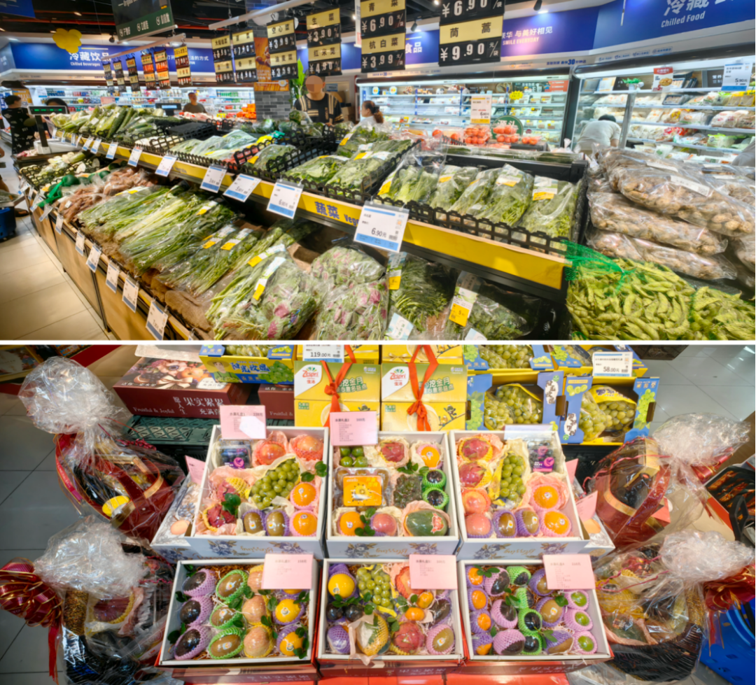 店內(nèi)商品涵蓋果蔬、鮮切肉鋪、烘焙牛奶、預(yù)制菜、日配食雜、零食、酒水飲料、廚衛(wèi)百貨、文具用品、兒童玩具、香煙等品類,SKU多達(dá)7000多個(gè),滿足全年齡段全場(chǎng)景購(gòu)物需求。