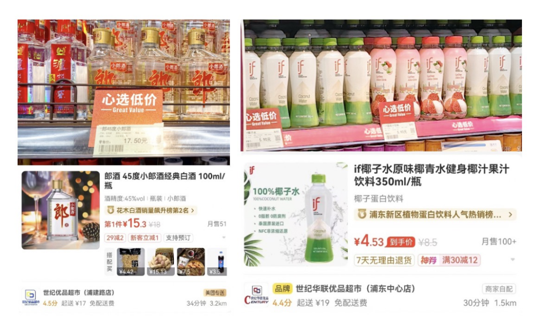 即便是心選低價(jià),相較生鮮電商而言,很難具備吸引力。17.5元的小郎酒,還有5.9元的椰子水,在某電商平臺(tái)上看到的價(jià)格要低10%以上,同時(shí)后者要具備自有的配送上門(mén)服務(wù)。