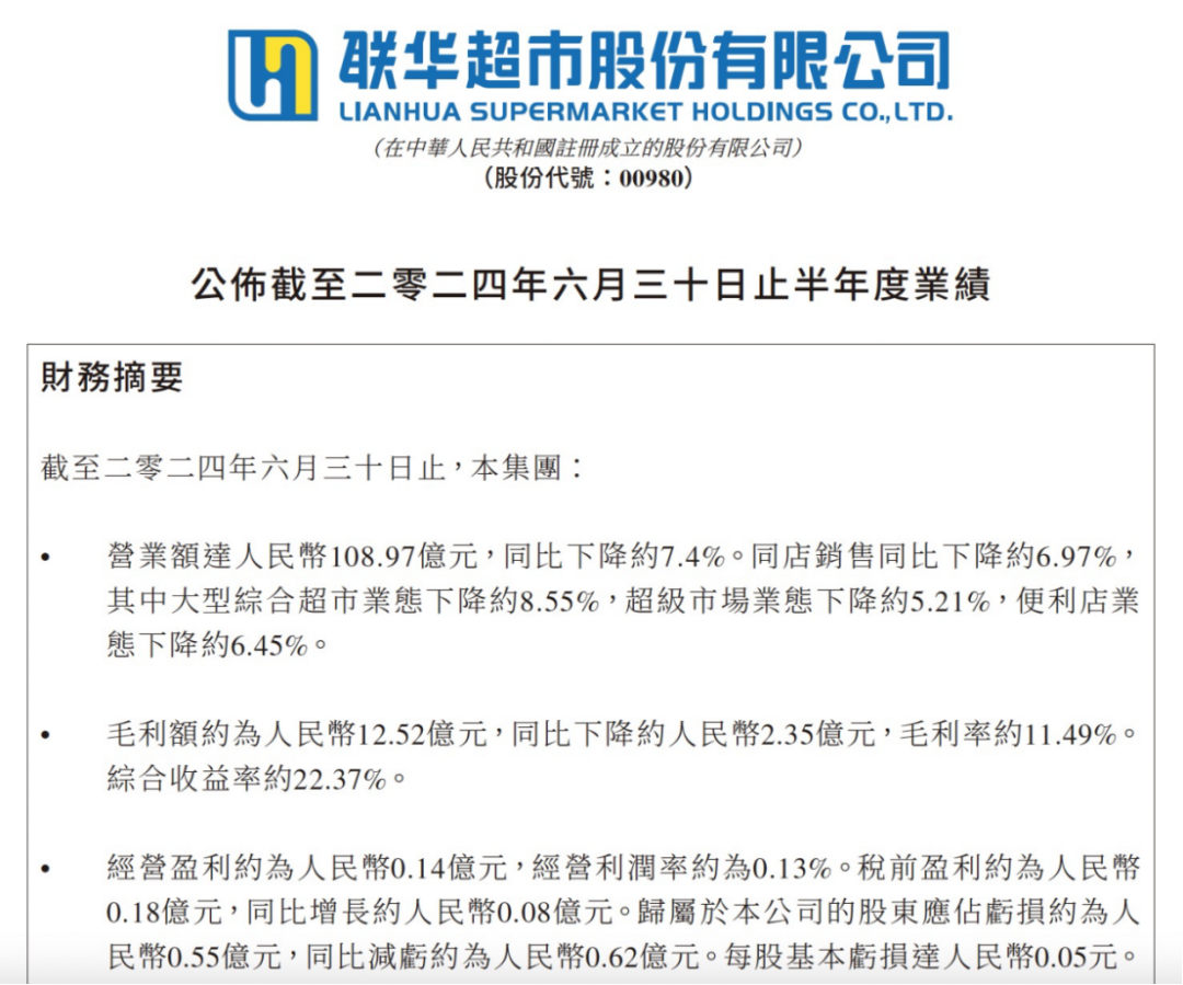 從2014到2023年,聯(lián)華超市一直未盈利,2023年創(chuàng)下歷年虧損新高,盈虧近8億元。毛利水平也屢創(chuàng)新低,2024年上半年的毛利率只有11.49%。凈利率的好轉(zhuǎn)更多來(lái)源來(lái)成本預(yù)算的管控,而不是經(jīng)營(yíng)上的開(kāi)源。