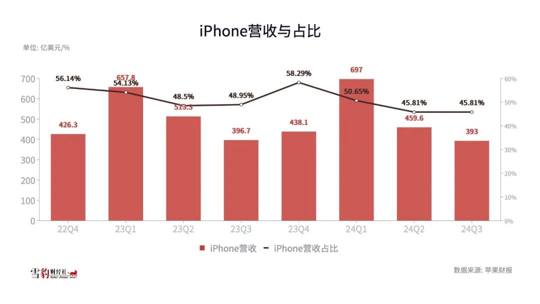 近8個(gè)財(cái)季,即使在銷售淡季,iPhone營(yíng)收占蘋果總營(yíng)收的比例依然接近一半。服務(wù)、AirPods等收入的增長(zhǎng)也依賴iPhone的銷量。庫(kù)克在努力降低iPhone的營(yíng)收貢獻(xiàn)占比,但在短期內(nèi),這棵搖錢樹(shù),對(duì)蘋果來(lái)說(shuō)沒(méi)有平替。