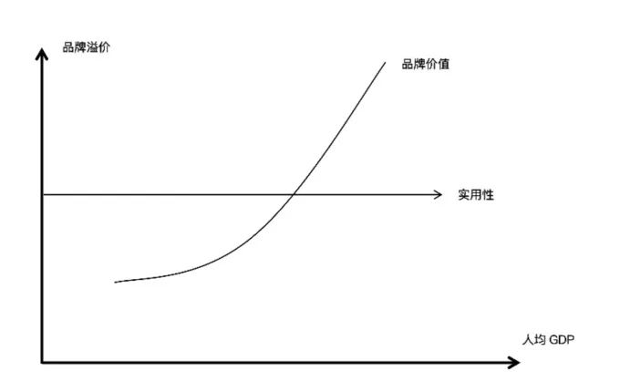 根據(jù)馬斯洛需求層次理論,其最底層的是生理需求,即能夠生存。在“吃不飽”的時段,對于商品,人們追求的自然無所謂品牌而是實用功能。而奧特萊斯是基于“大品牌”的下架、斷碼、非當季的折扣銷售,這里品牌是第一位的。也就是,當處于溫飽時代,奧特萊斯是發(fā)展不起來的,因為“品牌”不如實用有價值(見下圖)。也就是,跨過溫飽線,品牌價值才開始有意義。