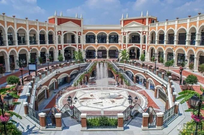 還是以濟南首創(chuàng)奧特萊斯為例吧。它是一個多首層設計、地上三層開放式街區(qū),建筑以意大利風情為主。為什么是開放式街區(qū)?
