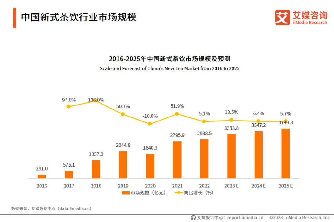 艾媒咨詢披露的數(shù)據(jù)顯示,預(yù)計(jì)2025年,中國新式茶飲市場(chǎng)規(guī)模將達(dá)3749.3億元,2023年-2025年的復(fù)合年增長(zhǎng)率僅為6.05%,相較前幾年超90%的同比增速,大幅收窄。