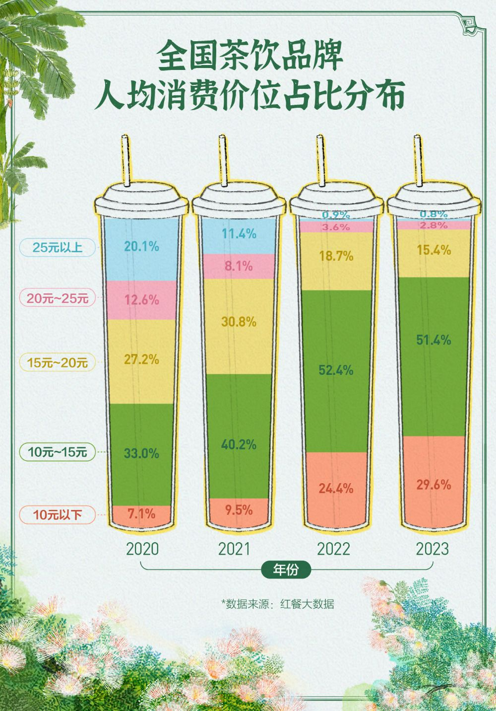 整體而言,紅餐大數(shù)據(jù)顯示,2023年,中國新茶飲品牌人均消費(fèi)10元以下占比為29.6%,相較2020年上漲22.5個(gè)百分點(diǎn);20元以上占比僅為3.6%,相較2020年下降29.1個(gè)百分點(diǎn)。