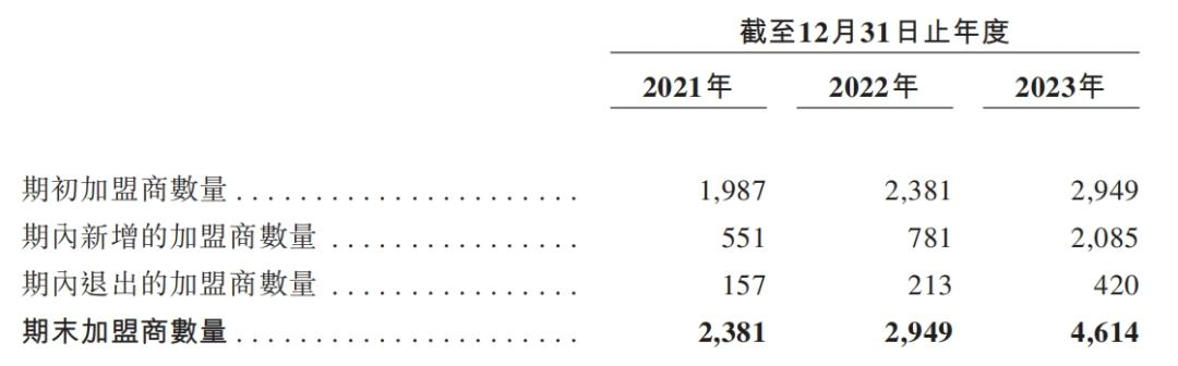 對(duì)比而言,2023年,古茗加盟商單店經(jīng)營(yíng)利潤(rùn)為37.6萬元,加盟商單店經(jīng)營(yíng)利潤(rùn)率達(dá)20.2%。因經(jīng)營(yíng)狀況好、盈利能力強(qiáng),2021年-2023年,古茗的加盟商數(shù)量從2381名上升至4614名,門店數(shù)量由5694家增加至9001家。