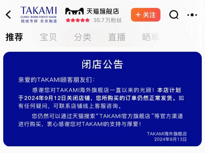 聯(lián)商快訊:近日,日本護膚品牌TAKAMI宣布將于今年9月12日關閉天貓海外旗艦店,截至9月10日16:50,該店鋪粉絲數(shù)為35.7萬。而該品牌的天貓官方旗艦店仍在正常營業(yè),粉絲數(shù)為19萬。目前該品牌的微信小程序官方商城、抖音官方旗艦店均正常營業(yè)。