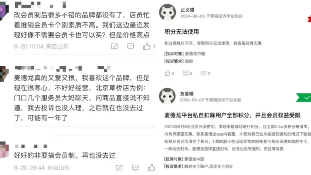 社交平臺中,常見消費者吐槽對于麥德龍產品及會員服務的不滿。有網友表示,改會員制后很多不錯的品牌都沒有了,店員開始忙著推銷會員卡,服務也不好。此外,在黑貓投訴平臺上,關于麥德龍的投訴也屢見不鮮,主要集中在會員退費流程繁瑣、用戶積分信息無故被扣除等問題上。