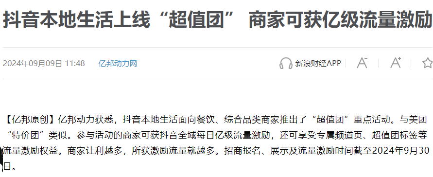 近日,抖音本地生活面向餐飲、綜合品類商家推出了“超值團(tuán)”重點(diǎn)活動(dòng),與美團(tuán)的“特價(jià)團(tuán)”有異曲同工之妙。