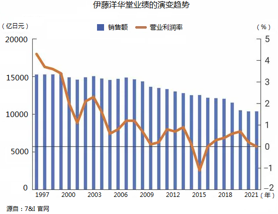 伊藤洋華堂在1998年度銷售額超過1.5萬億日元,到2022年度減少到1萬億日元,總額銷售額減少了三分之一,營業(yè)利潤率從超過4%下降到無利潤虧損狀態(tài)。