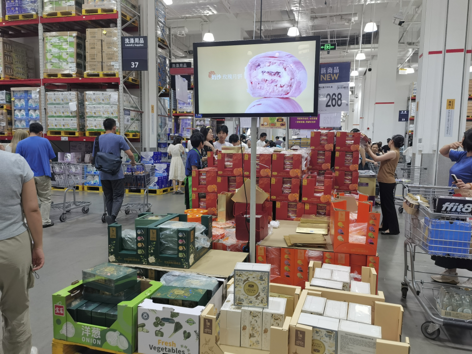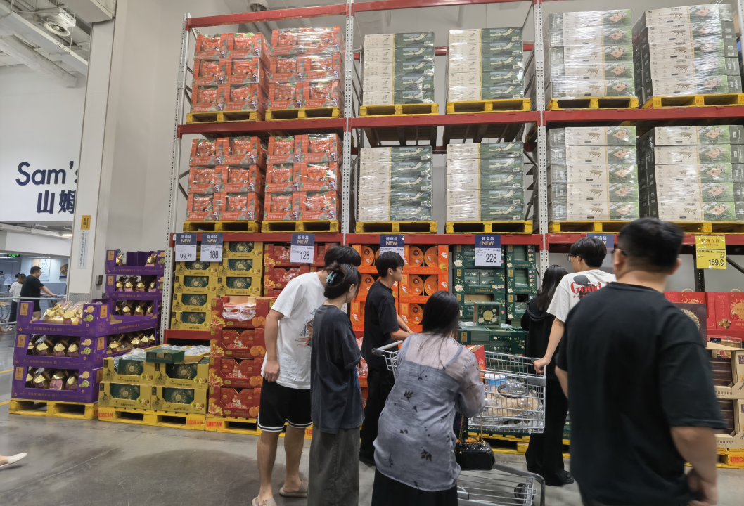 再者,在本土化運(yùn)營(yíng)上,進(jìn)入中國(guó)28年的山姆也具備更深厚的經(jīng)驗(yàn)。臨近中秋節(jié),在Costco杭州店內(nèi),并未看到明顯的節(jié)日元素和主題陳列。相比之下,山姆則深諳此道,抓住了會(huì)員的送禮需求,不僅在進(jìn)店入口處就堆放了月餅禮盒,且在賣(mài)場(chǎng)過(guò)道處設(shè)置了月餅專(zhuān)區(qū),并提供相應(yīng)的包裝和全國(guó)配送服務(wù)。
