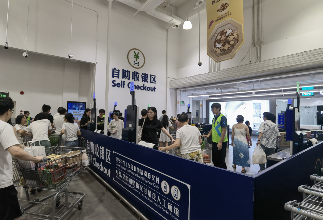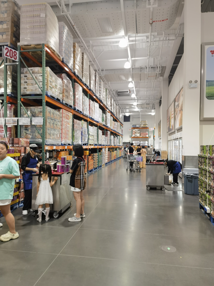 ·收銀臺(tái):進(jìn)入Costco時(shí),約有5個(gè)收銀臺(tái)開(kāi)放收銀,每個(gè)柜臺(tái)等待結(jié)賬的顧客約1-2人;山姆開(kāi)放的收銀臺(tái)共13個(gè),平均排隊(duì)人數(shù)為3-5人,自助收銀區(qū)也有小長(zhǎng)隊(duì)。