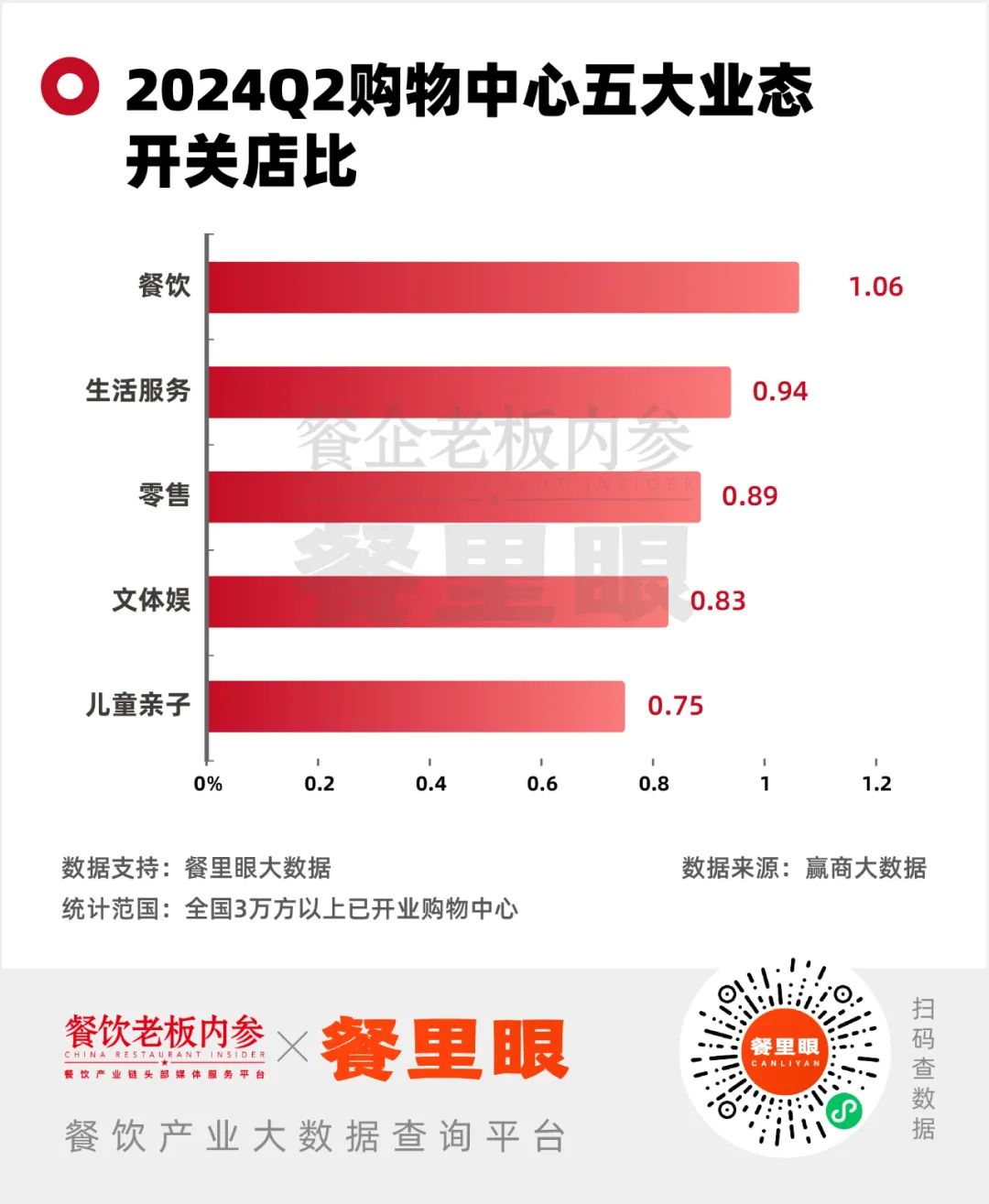 根據(jù)贏商網(wǎng)大數(shù)據(jù)監(jiān)測,2024年1-8月,全國新開業(yè)商場,已超過170個。一批玩轉(zhuǎn)情緒價值、稀缺體驗、細分需求、跨界混搭的新奇業(yè)態(tài)和品牌,點燃年輕人的消費熱情,推動商業(yè)的車輪向前。從供給端看,2024年第二季度購物中心五大業(yè)態(tài)開關店比中,餐飲依舊領跑,開關店比達到1.06,餐飲新開店數(shù)量占總新開店數(shù)量的36%,在購物中心門店擴張活躍。