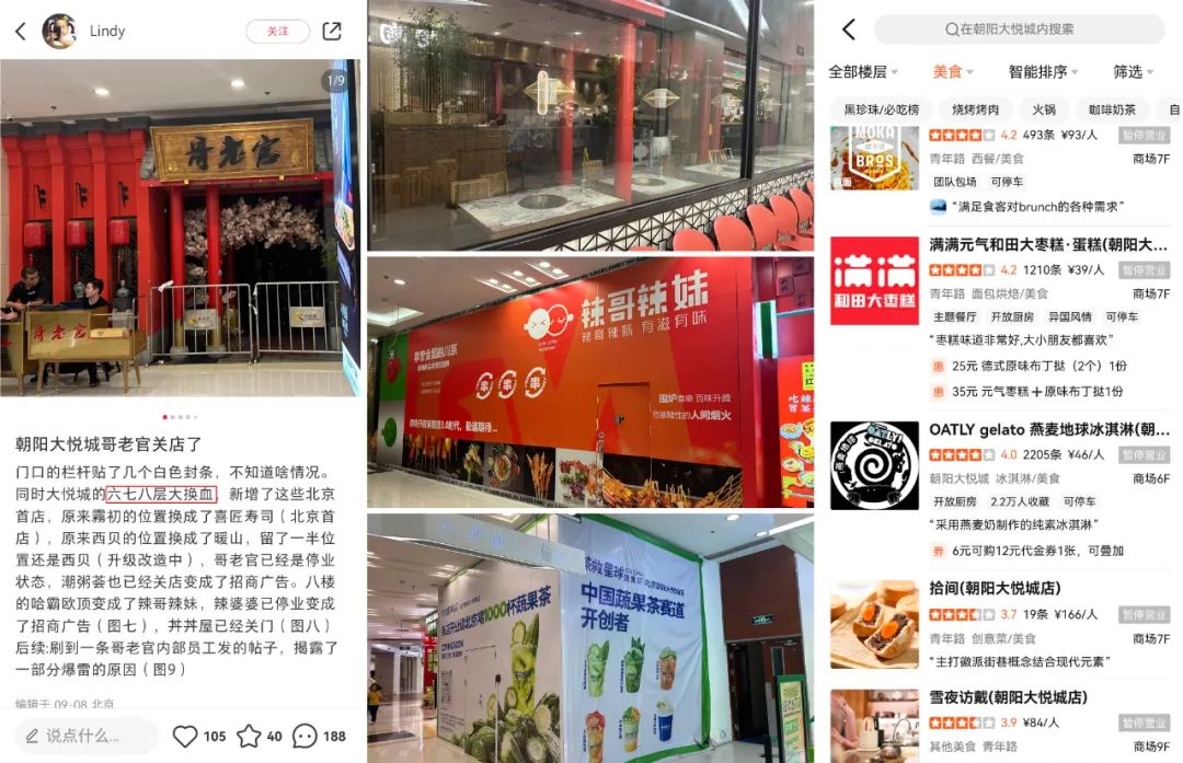 不僅是老牌商場百貨,就連一些頂流商圈,同樣需要處理類似的狀況。近日,有網(wǎng)友在社交媒體表示“北京朝陽大悅城六七八層大換血”,一些門店被新的圍擋遮住。雖然“暫停營業(yè)”的數(shù)量,在一百多家餐飲的總量面前不算很大,但仔細看來,確實大多都集中在6-9層。