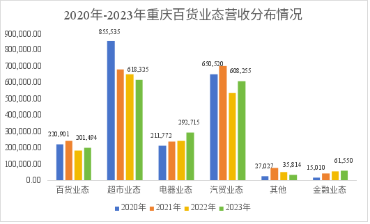 從經(jīng)營(yíng)業(yè)態(tài)營(yíng)收規(guī)模來看,超市業(yè)態(tài)在過去四年里下降明顯,由2020年的85.5億元下跌至2023年的61.8億元。電器業(yè)態(tài)增幅明顯,由2020年的21.1億上升至2023年29.2億元。金融業(yè)態(tài)(參股投資的馬上消費(fèi))營(yíng)收也逐年呈增長(zhǎng)態(tài)度,由2020年的1.5億元上升至2023年的6.15億元。百貨和汽貿(mào)業(yè)務(wù)整體略有下降,跌幅不到10%。