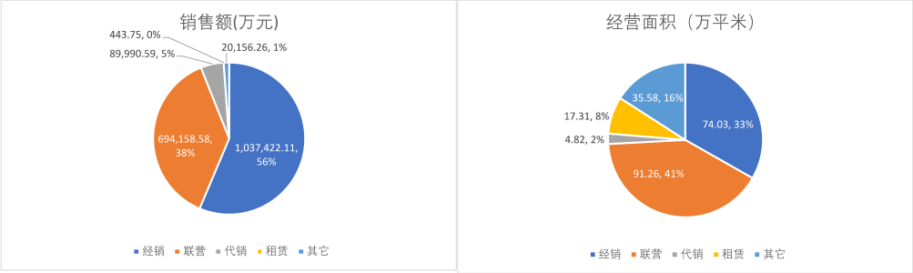 以2024年上半年財(cái)報(bào)數(shù)據(jù)為例,經(jīng)銷模式以33%的面積達(dá)成超過一半,近56%的銷售額;聯(lián)營(yíng)模式以41%的經(jīng)營(yíng)面積實(shí)現(xiàn)38%的銷售額。