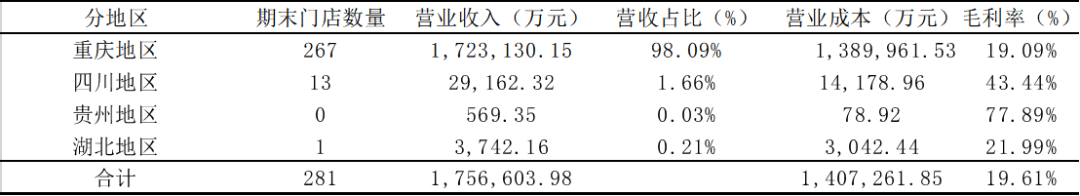 從經(jīng)營(yíng)區(qū)域來看,重慶百貨主要經(jīng)營(yíng)區(qū)域?yàn)橹貞c地區(qū),以2023年年報(bào)數(shù)據(jù)為例,重慶地區(qū)實(shí)現(xiàn)163.7億的營(yíng)收,營(yíng)收占比達(dá)到97.74%。四川、貴州和湖北地區(qū)累計(jì)只有3.78億元,占比不到3%,貴州地區(qū)唯一一家店也在2023年7月關(guān)停。