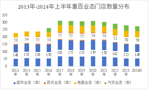 從經(jīng)營(yíng)業(yè)態(tài)門店數(shù)量來看,2017年重慶百貨的門店數(shù)量達(dá)到峰值311家,其中超市業(yè)態(tài)有181家,百貨業(yè)態(tài)有55家,電器業(yè)態(tài)有47家,汽貿(mào)業(yè)態(tài)有28家。2024年上半年門店數(shù)量共有274家,其中超市業(yè)態(tài)縮減明顯,減少至149家,減少了近20%;百貨和電器業(yè)態(tài)也有所減少,分別只剩50家店和41家店;汽貿(mào)業(yè)態(tài)門店數(shù)量是近六年來唯一增長(zhǎng)業(yè)態(tài),門店數(shù)量達(dá)34家。