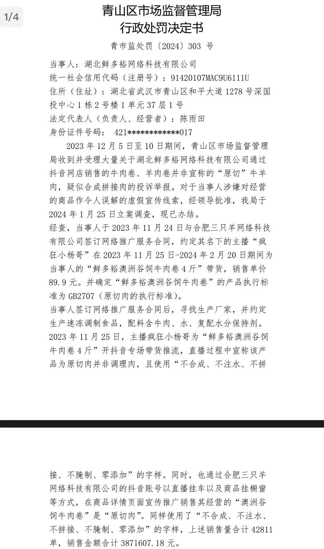 而小楊哥則在近日因帶貨的“鮮多!迸H饩砩嫦犹摷傩麄鞫萑胼浾擄L(fēng)波,其中商家已被處罰50萬(wàn)元,但因三只羊不在相關(guān)部門(mén)的管轄區(qū)內(nèi),還尚未確定處罰情況。